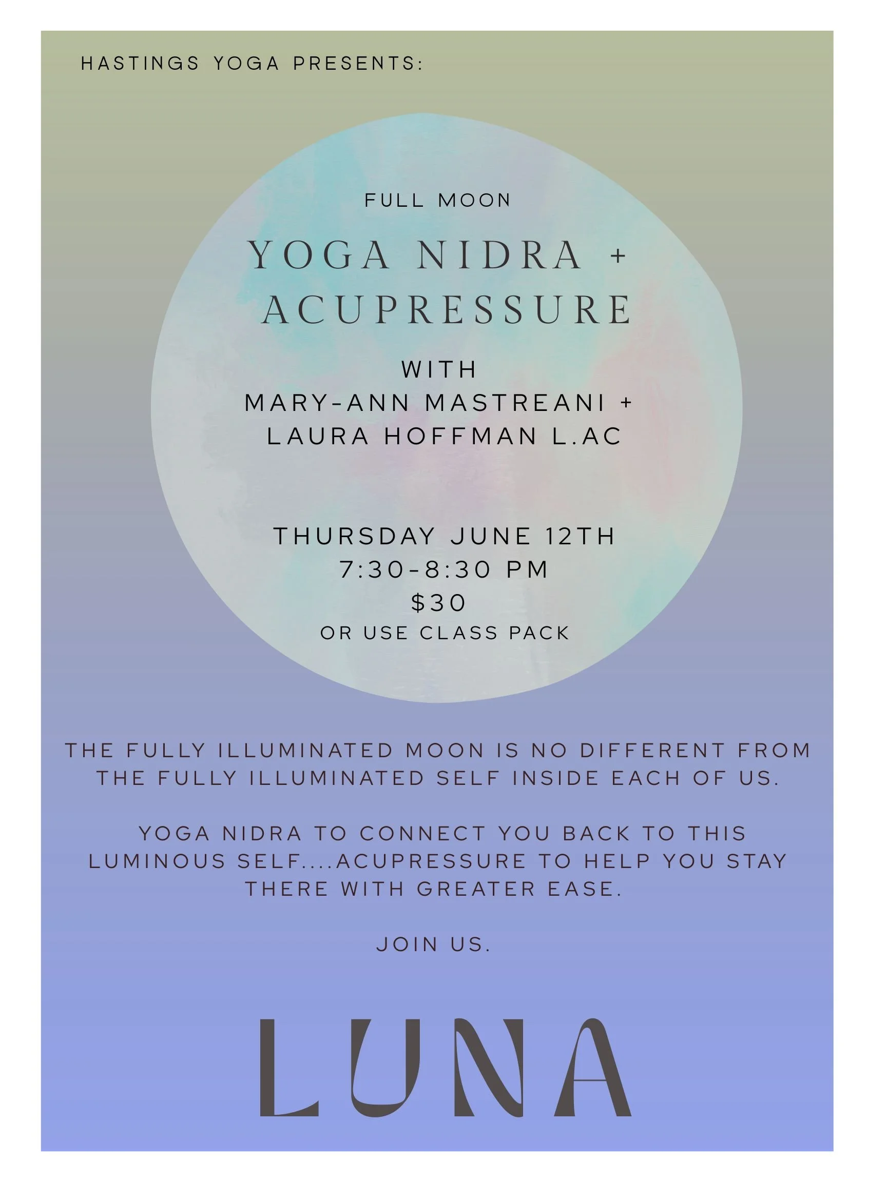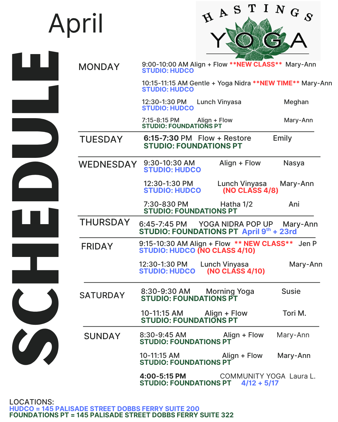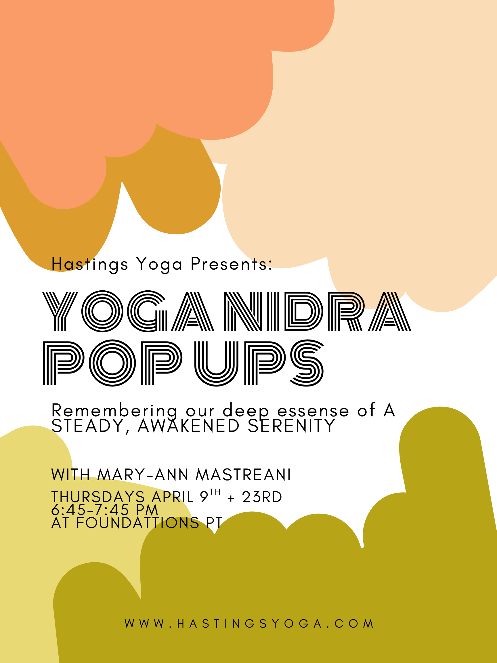 Additionally: We have yoga nidra + community class pop ups 2 times each for April…please make a note of those classes and register early to reserve your spot!