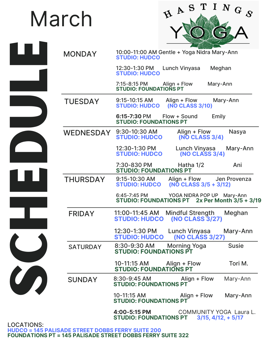 For March We will continue to offer our classes at HUDCO + Foundations Physical Therapy in Dobbs Ferry.